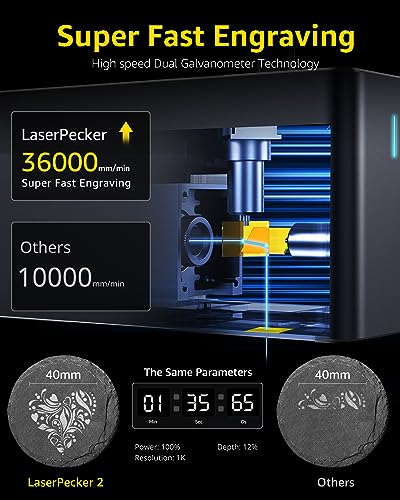 ⚡⚡ Hogere Productiviteit: LaserPecker 2 lasergraveermachine kan een maximale graveersnelheid bereiken van 36000 mm/min. De 0,05 mm gecomprimeerde laserspot zorgt voor een hoge precisie bij het graveren van fijne lijnen en is twee keer zo dun als gewone lasers. 1K/1,3K/2K pixel resolutie opties beschikbaar volgens de behoeften. Frame/grafiekvoorbeeldfunctie visualiseert de graveerpositie vóór het graveren.